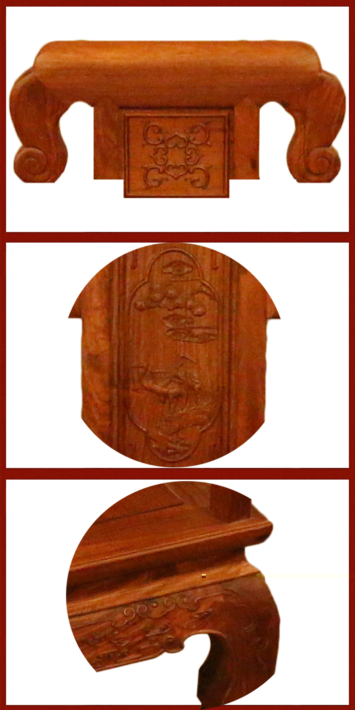 之后,是餐椅的主架骨,坐板以及四腳處,餐椅坐板平整圓潤,四處椅腳處亦呈圓滑之態(tài)向下順勢(shì)延伸,頗顯自然流和,餐椅正左右三面各有三條支板木架相接,使之更加穩(wěn)固,椅腳各處亦有多處祥云絲邊鑲嵌裝飾之上,整體裝飾上也愈更顯得和諧工整美觀。