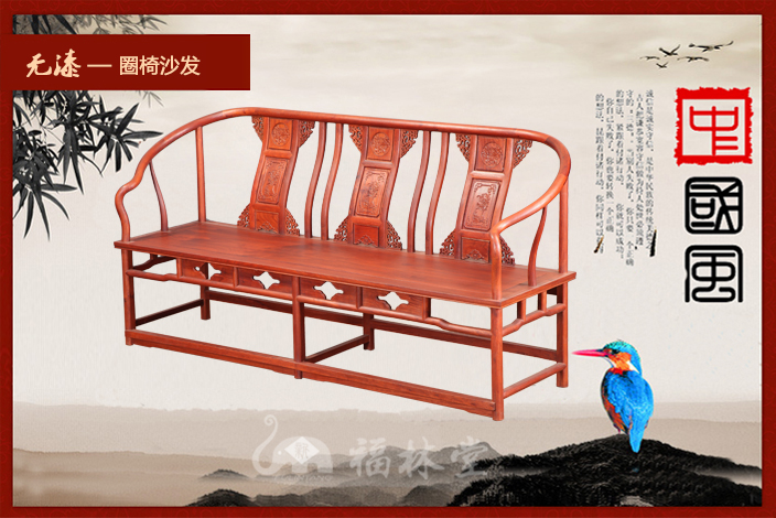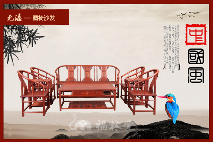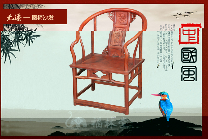 圈椅,因椅圈恰似羅圈,民間又稱“羅圈椅”或“圓椅”,圈椅的造型上圓下方,外圓內(nèi)方,這暗和了中國(guó)傳統(tǒng)文化中的乾坤之說(shuō),乾為天為圓,坤為地為方,而外圓內(nèi)方則是中國(guó)傳統(tǒng)文化中所崇尚的一種品德,雖在處事上有所圓滑但卻內(nèi)在有所堅(jiān)持。它最明顯的特征則是在圈背上連結(jié)著扶手,從高到低一順而下,座靠時(shí)可使人的臂膀都倚著圈形的扶手,感到十分舒適,頗受人們喜愛!