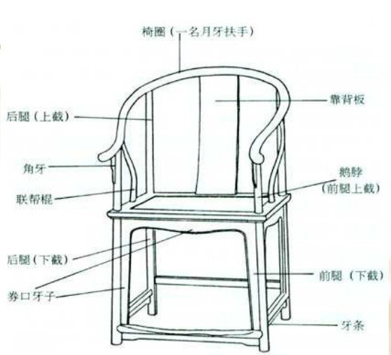 關(guān)于圈椅的結(jié)構(gòu)構(gòu)造,我們就用最經(jīng)典也是最原始的明式圈椅作為描述對(duì)象,它的每個(gè)結(jié)構(gòu)構(gòu)造以及命名術(shù)語包括: