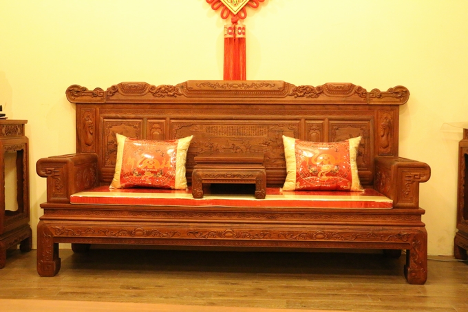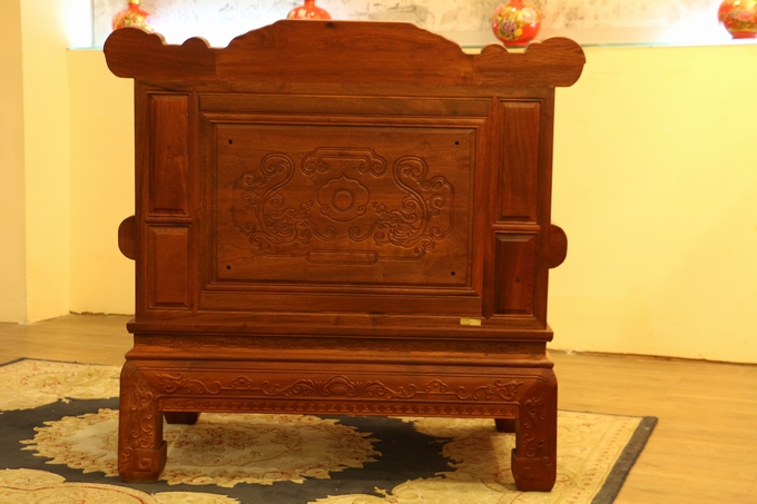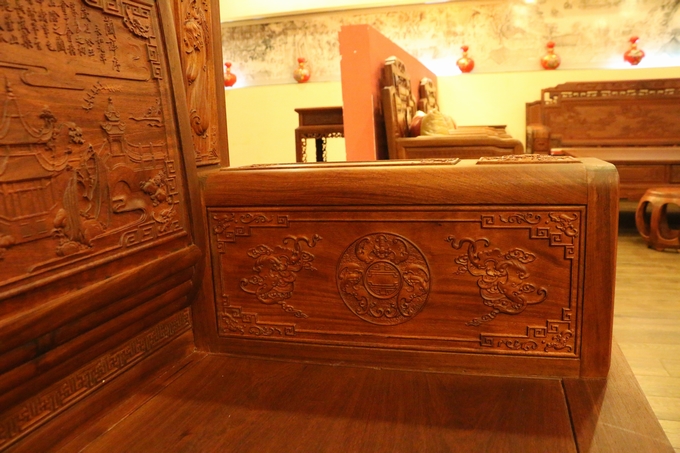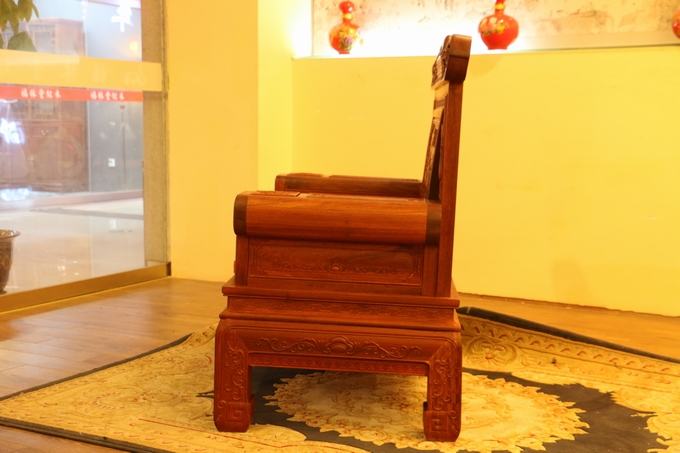 該款沙發(fā)整體之表現(xiàn)顯得極為嚴(yán)密厚實(shí),無一處鏤空之雕飾,在最上端背板處的中間部分為留有一些花紋之邊幅加以修飾,顯得極為浮美雅觀。而在其左右兩側(cè)則另雕繪有“麒麟戲珠”與“雛鳥朝鳳”兩處紋飾圖案:“麒麟戲珠”紋飾設(shè)計(jì)地較為特別,如草龍紋一般,除頭部精細(xì)雕刻外,其余四肢與形體均簡略化,身體部位采用一銜邊條帶狀的紋飾相串于圓珠內(nèi),頗顯靈動(dòng)神韻;而“雛鳥朝鳳”的圖案則是在背板最上部的左右兩端,末端是饒有一圓弧之設(shè)計(jì)為修飾收尾,顯得極為婉轉(zhuǎn)柔和圓潤。紋飾的圖案為一只可愛的雛鳥深情脈脈含情注視著前方鳥鳳的場景,顯得實(shí)為溫馨。鳳凰處之設(shè)計(jì)處理地也與前面麒麟一同:頭部細(xì)化,其余簡略帶過,鳳凰處眼眸之雕飾顯得極為醒目,神情表現(xiàn)形態(tài)逼真,層次感和手觸感亦十分明瀝彰顯,而經(jīng)燙蠟處理的表面緬花材質(zhì)表現(xiàn)地也更為細(xì)膩淡雅,極盡奢華。