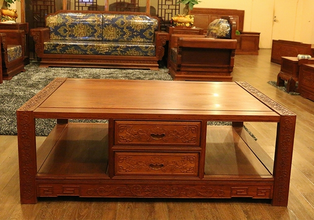 其他幾個部件:二人座長沙發(fā)處之紋飾設計以及大體形態(tài)與單人座沙發(fā)大致保持了一致;而在高幾部分,除牡丹花紋飾外另還能看見的還有元寶圖案雕飾,雕繪于上方抽屜層面左右前方位置處,意帶有“滾滾財源”“吉祥富貴”之寓意;同樣在大平幾位置的紋飾也同高幾一同,而平滑顯著淡雅光澤的桌面更覺舒適。