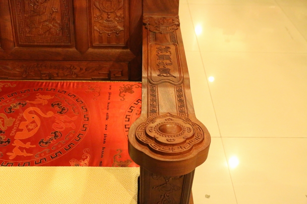 說完了背板,我們再來看看沙發(fā)的兩處扶手,在扶手上方的正中位置,雕繪有四個很清晰的字眼:萬事如意,字體仍是采用的古漢字字體,其筆畫彎延有致,筆鋒靈動飄逸,頗具藝術(shù)美感氣息,令人陶醉。而在其扶手末端之位置處,則是一分三層雕刻設(shè)計的立體紋飾圖案,用手輕撫摸之,層次立體感及舒適感十分明顯。另在扶手的外部側(cè)面處則還形象地雕繪有一框花籃,花籃內(nèi)花團(tuán)齊簇,顯得十分美艷,富貴華麗。