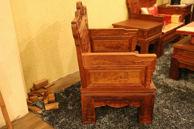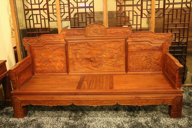 沙發(fā)的座椅面平整光滑,極盡原木材質(zhì)紋理之視覺感受;側(cè)面扶手處無(wú)任何鏤空面積之留飾,嚴(yán)實(shí)而框整,整體框架為矩形外觀設(shè)計(jì)。扶手上端正反兩面位置處,同樣雕繪有上處靠背板處鳳凰圖案形狀之紋飾,扶手底部正反兩面位置則雕繪有一些商周時(shí)期使用的器具,如斟酒器、編鐘等。
