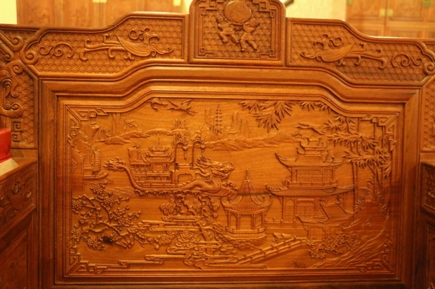 接下來(lái),我們來(lái)看看沙發(fā)背靠板正面的主體部分,其畫案外部輪廓形狀呈現(xiàn)如一墨水瓶式形狀設(shè)計(jì),上端較為扁實(shí)。內(nèi)部雕刻圖案展現(xiàn)得極為豐富艷麗,正如該款沙發(fā)名字所闡述的那樣——“漢宮春曉”,宛如一幅文人古畫卷中的景致,可以很清晰地看見:那波光漣漪的湖水載著亭臺(tái)綺立的龍舟,婉延而緩緩向前開來(lái)的景象,前段龍首處神情惟妙惟肖極為莊重而氣定神閑,畫案立于其主體的正中位置,顯得極為惹目和顯眼。在湖水岸邊,靠右端的湖岸上則是那茂密蔥郁的竹林,雖未能身處畫中,卻好似可以聽見,那一葉葉竹瓣隨著微風(fēng)飄蕩,窸窣碎碎交相搖晃時(shí)所發(fā)出的聲響,頗顯幽靜而深遠(yuǎn)。另在畫案后方的遠(yuǎn)景處,除了稀疏而立的幾目草木郊野,還有一座頂天而豎的寶塔,遠(yuǎn)遠(yuǎn)眺望著,好似氣派風(fēng)度。而在湖水的上方,還可以瞥見那兩只展翅高飛的仙鶴,它們乘風(fēng)而列,自由翱翔時(shí)的自在景象,也為整體的畫卷添加了某種只有身處仙境神域時(shí)所能感受體會(huì)的到的意境神韻感受,另外仙鶴它也代表了長(zhǎng)壽與富貴,它仙風(fēng)道骨,為羽族之長(zhǎng),是為該幅富麗堂皇畫卷中的一處獨(dú)特景觀,妖嬈而鶴立。在整體圖案的其他位置,還雕繪有幾目莊嚴(yán)氣派矗于湖岸的亭臺(tái)樓倚,一尾身處龍舟后方悄悄而出的小帆舟,以及附著于畫卷中央下方位置處,飄縷浮動(dòng)緩緩而延的祥云…