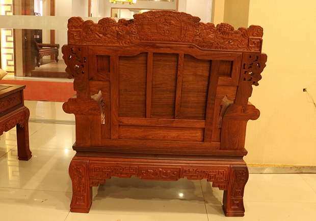 該款沙發(fā)整體的特點,較之其他沙發(fā)款式顯得更為豐滿完整,其靠背板處的鏤空面積極少,僅單單在背板的底部靠近扶手的左右兩側(cè)以及其上方懷抱元寶的兩處侍童處存有。在背板的最上端,左右兩側(cè),雕刻有兩只憨態(tài)可掬而又威風凜凜的麒麟,然后在其中間位置,則是一對母子在簾倚之下倚靠著圓凳幸福生活的溫馨畫面。談到麒麟,在民間有"麒麟送子"的說法,它對老百姓而言,是送子神獸,據(jù)傳中國古代大思想家孔子即為麒麟所送,它是吉祥的象征,可以為人們帶來子嗣,也可保佑其平安聰慧賢德。