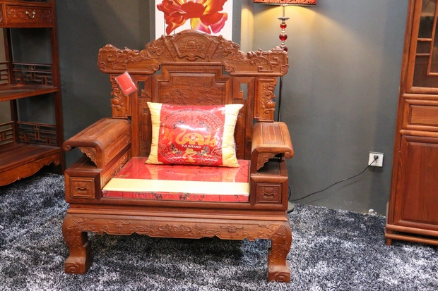 產(chǎn)品紋飾方面,該款沙發(fā)集中描繪了祥云、火珠、銅錢、元寶、蝙蝠、壽桃、松柏、金鎖以及一系列簡單的幾何紋飾。單以單人位沙發(fā)為例,在結構上,沙發(fā)整體類似有寶座風格之外觀設計,座腳之高度稍顯矮實,并且寬厚粗壯而有力,稍許彎延。而在座面下方連接四處座腳的板面處另還雕繪有可以用做辟邪之用的寓意吉祥富貴長壽之意的金鎖紋飾,以及在其左右兩側鑲嵌串饒著的寓有財源廣進源源不斷之意的環(huán)環(huán)銅錢紋飾,而在這幅“金鎖銅錢”組合圖案的左右兩側,還雕繪有兩只簡約靈動撫媚秀氣的草鳳紋,彰顯著富貴與幸福的美好寄寓。