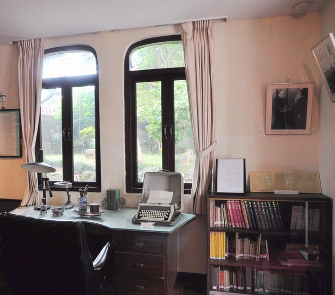 “我要一個(gè)好書齋,一個(gè)好煙斗?!边@是林語堂40歲時(shí)的理想。他的書房中鋪著紅色的地毯,擺著黑色的沙發(fā),墻壁上是他與張大千、錢穆的合照,兩面墻壁前是寬大的書柜,保存著他的4000多種藏書。門口處就是一張他親自設(shè)計(jì)的寫字臺(tái),臺(tái)子的前面凹進(jìn)去一塊弧形,使他略顯肥胖的身軀在寫作的時(shí)候更加舒適一些。他在書桌前的經(jīng)典姿態(tài)是,腳踏著半開的抽屜,一手拿書,一手持煙斗。
