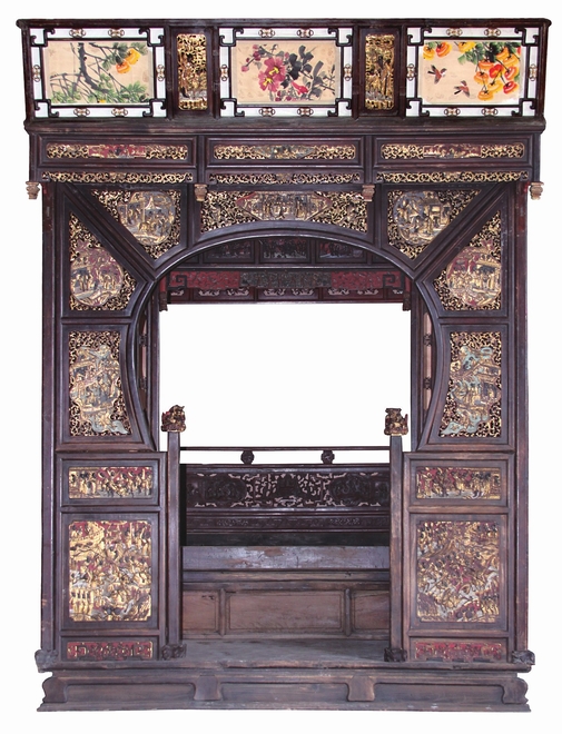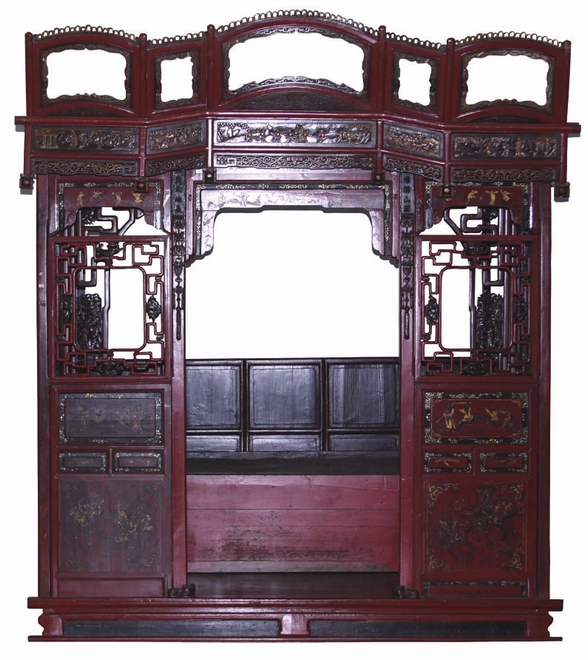 整張床高大寬闊,帶圍窗,踏步寬敞,豐富多彩的圖案運用透雕、彩繪、貼金等多種手法,洋溢著喜慶吉祥的新婚氣息。